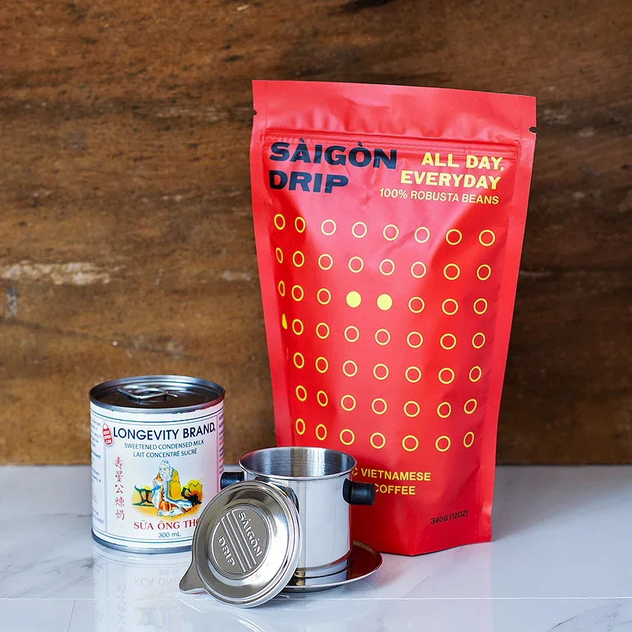 Spark joy in a coffee aficionado’s world this holiday with Saigon Drip Vietnamese coffee drip featuring O.G. blend coffee beans sourced out of Dak Lak province in Vietnam, condensed milk and a stainless steel embossed phin filter.