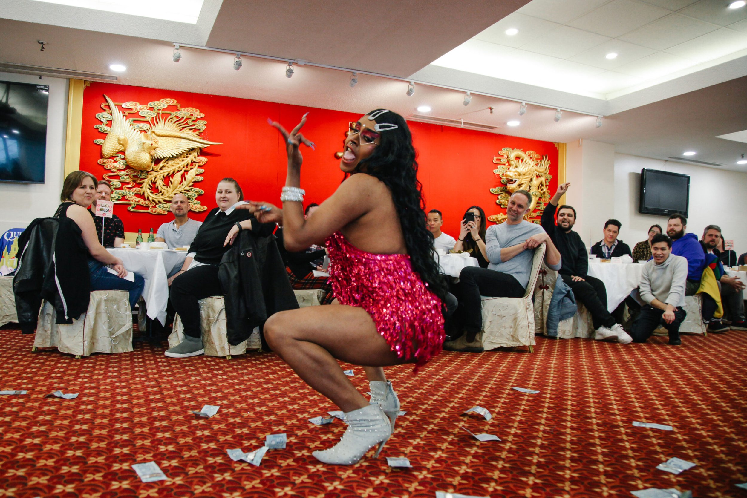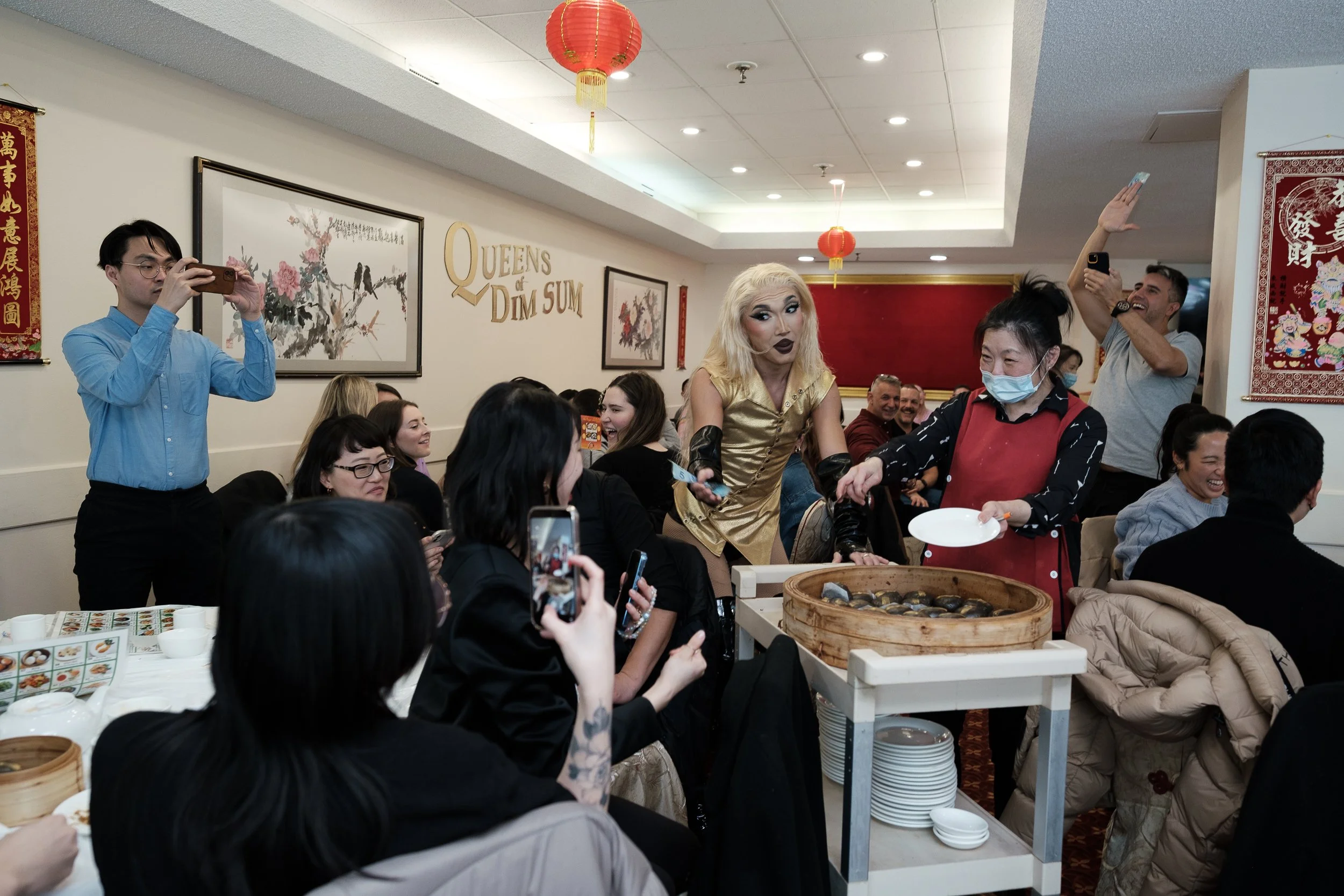 The scent of jasmine tea and freshly steamed dumplings fills the air as drag performer Summer Buffet, lip-syncs to Paula Tsui’s Xi Qi Yang Yang (喜氣洋洋), a 1979 song that once echoed through Hong Kong living rooms. A dim sum server glides between tables, her warm smile reflecting the energy of the crowd. As Summer Buffet sways to the melody of a Cantopop classic, Asian elders from a few tables away glance over, their expressions shifting from surprise to quiet recognition.