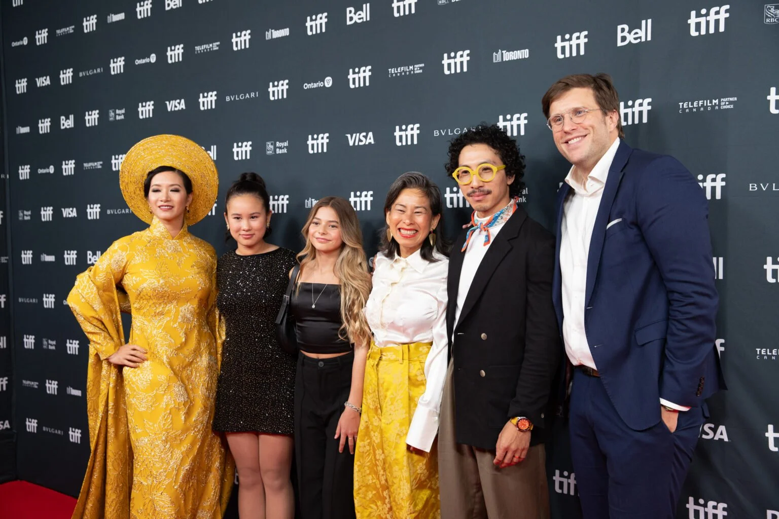 Chantal Thuy, Chloé Djandji, Mali Corbeil-Gauvreau, Kim Thúy, Jean Bùi, and Charles-Olivier Michaud attend the “Ru” premiere during the 2023 Toronto International Film Festival. Photo: Ariane Laget/Agence Avec Sheila/Immina Films.
