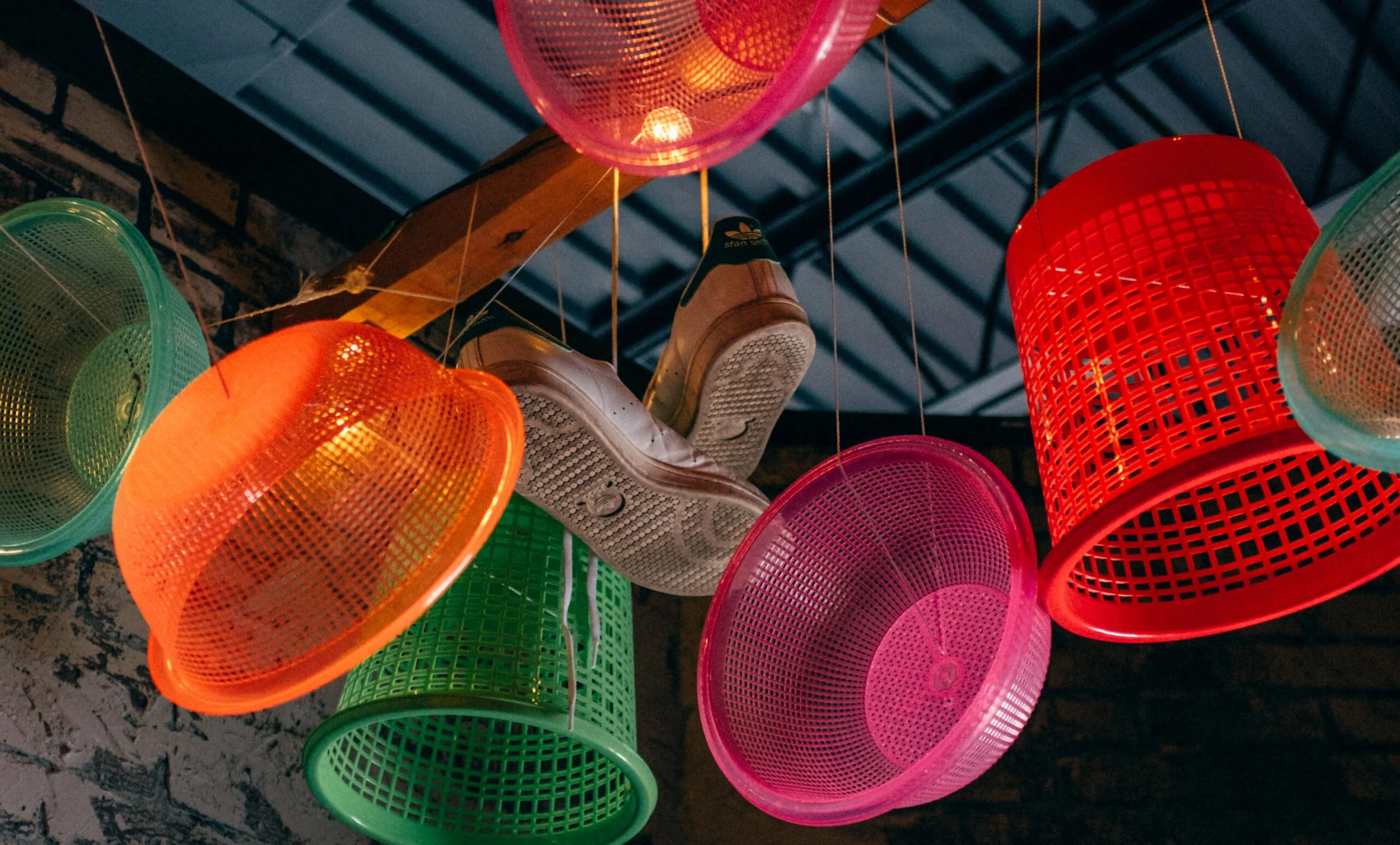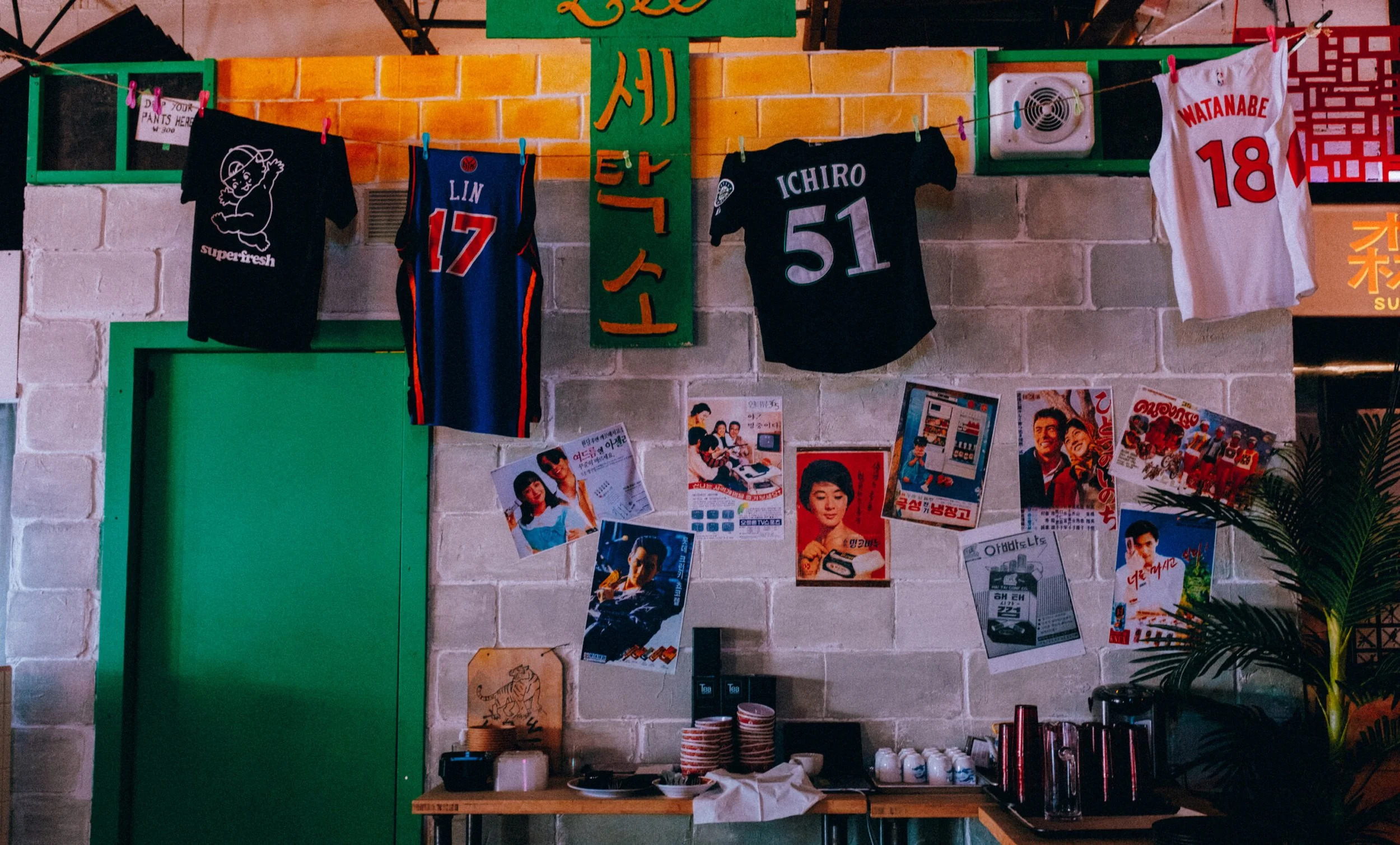 Lui’s sister, Stephanie Lui-Valentim, worked on creative direction for Superfresh and is the brains behind all of the intricate, well-thought-out details that make the space truly embody the feeling of an Asian night market. She curated the vintage takeout menus and colourful colanders seen at the entrance, the selection of movie posters lined across the front of the bar, and the Korean playing cards and stickers (many of which she cut by hand) on display with mahjong tiles on the bar top and the show-stopping Lucky Cat wall seen at the entrance.
